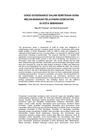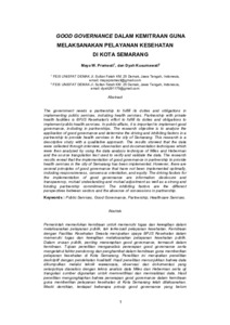 Maya, W. Pramesti and Dyah, Kusumawati (2021) Good governance dalam kemitraan guna melaksanakan pelayanan kesehatan di Kota Semarang. Public Service and Governance Journal, 2 (1): 7. pp. 67-78. ISSN 2963-7252