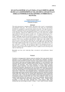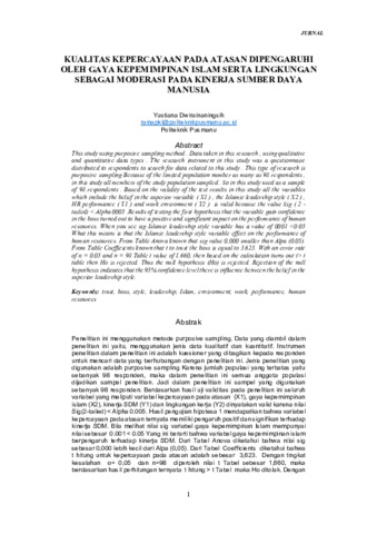 Penelitian ini menggunakan metode purposive sampling. Data yang diambil dalam penelitian ini yaitu, menggunakan jenis data kualitatif dan kuantitatif. Instrumen penelitian dalam penelitian ini adalah kuesioner yang dibagikan kepada responden untuk mencari data yang berhubungan dengan penelitian ini. Jenis penelitian yang digunakan adalah purposive sampling Karena jumlah populasi yang terbatas yaitu sebanyak 98 responden, maka dalam penelitian ini semua anggota populasi dijadikan sampel penelitian. Jadi dalam penelitian ini sampel yang digunakan sebanyak 98 responden. Berdasarkan hasil uji validitas pada penelitian ini seluruh variabel yang meliputi variabel kepercayaan pada atasan (X1), gaya kepemimpinan islam (X2), kinerja SDM (Y1) dan lingkungan kerja (Y2) dinyatakan valid karena nilai Sig(2-tailed) < Alpha 0.005. Hasil pengujian hipotesa 1 mendapatkan bahwa variabel kepercayaan pada atasan ternyata memiliki pengaruh positif dan signifikan terhadap kinerja SDM. Bila melihat nilai sig variabel gaya kepemimpinan Islam mempunyai nilai sebesar 0.001 < 0.05 Yang ini berarti bahwa variabel gaya kepemimpinan islam berpengaruh terhadap kinerja SDM. Dari Tabel Anova diketahui bahwa nilai sig sebesar 0,000 lebih kecil dari Alpa (0,05). Dari Tabel Coefficients diketahui bahwa t hitung untuk kepercayaan pada atasan adalah sebesar 3,623. Dengan tingkat kesalahan α= 0,05 dan n=98 diperoleh nilai t Tabel sebesar 1,660, maka berdasarkan hasil perhitungan ternyata t hitung > t Tabel maka Ho ditolak. Dengan demikian hipotesis nol (Ho) ditolak . Ditolaknya hipotesis nol menunjukkan bahwa pada tingkat keyakinan 95% terdapat pengaruh antara kepercayaan pada atasan terhadap gaya kepemimpinan.