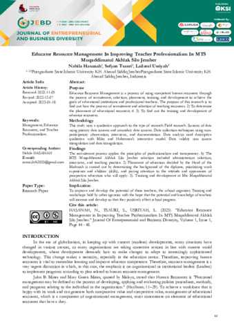 Nabila, Hasanah and Sofyan, Tsauri and Lailatul, Usriyah (2023) Educator resource management in improving teacher professionalism in MTS Muqaddimatul Akhlak Silo Jember. Journal of Entrepreneurial and Business Diversity, 1 (1): 5. pp. 44-48. ISSN 2985-5365