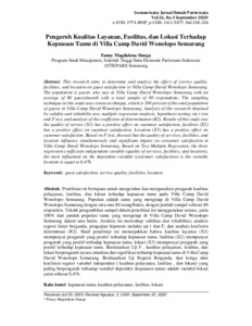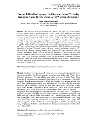 Fanny, Magdalena Sinega (2020) Pengaruh kualitas layanan, fasilitas, dan lokasi terhadap kepuasan tamu di Villa Camp David Wonolopo Semarang. Gema Wisata: Jurnal Ilmiah Pariwisata, 16 (3): 6. pp. 230-236. ISSN 1411-5077
