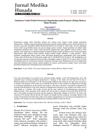Syafiq, Naqsyabandi (2022) Gambaran variasi waktu pewarnaan papanicolaou pada preparat sitologi mukosa mulut perokok. Jurnal Medika Husada, 2 (1): 4. pp. 19-24. ISSN 2829-2871