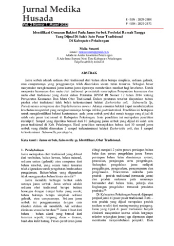Mulia, Susanti (2022) Identifikasi cemaran bakteri pada jamu serbuk produksi rumah tangga yang dijual di salah satu pasar tradisional di Kabupaten Pekalongan. Jurnal Medika Husada, 2 (1): 5. pp. 25-28. ISSN 2829-2871