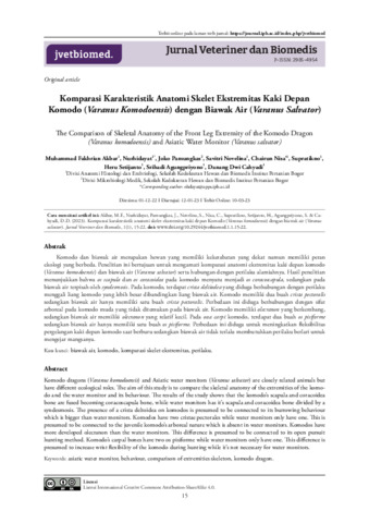 Komodo dan biawak air merupakan hewan yang memiliki kekerabatan yang dekat namun memiliki peran ekologi yang berbeda. Penelitian ini bertujuan untuk mengamati komparasi anatomi ekstremitas kaki depan komodo (Varanus komodoensis) dan biawak air (Varanus salvator) serta hubungan dengan perilaku alamiahnya. Hasil penelitian menunjukkan bahwa os scapula dan os coracoidea pada komodo menyatu menjadi os coracoscapula, sedangkan pada biawak air terpisah oleh syndesmosis. Pada komodo, terdapat crista deltiodea yang diduga berhubungan dengan perilaku menggali liang komodo yang lebih besar dibandingkan liang biawak air. Komodo memiliki dua buah crista pectoralis sedangkan biawak air hanya memiliki satu buah crista pectoralis. Perbedaan ini diduga berhubungan dengan sifat arboreal pada komodo muda yang tidak ditemukan pada biawak air. Komodo memiliki olecranon yang berkembang, sedangkan biawak air memiliki olecranon yang relatif kecil. Pada ossa carpi komodo, terdapat dua buah os pisiforme sedangkan biawak air hanya memiliki satu buah os pisiforme. Perbedaan ini diduga untuk meningkatkan fleksibilitas pergelangan kaki depan komodo saat berburu sedangkan biawak air tidak terlalu membutuhkan perilaku berlari untuk mengejar mangsanya.