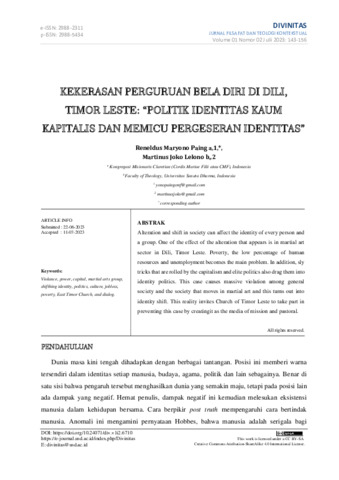 Reneldus, Maryono Paing and Martinus, Joko Lelono (2023) Kekerasan perguruan bela diri di Dili, Timor Leste: “Politik identitas kaum kapitalis dan memicu pergeseran identitas”. Divinitas: Jurnal Filsafat dan Teologi Kontekstual, 1 (2): 2. pp. 143-156. ISSN 2988-5434