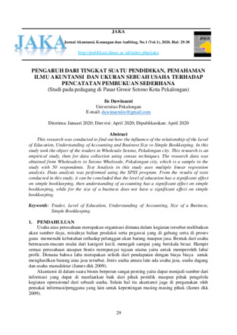 Iis, Duwinaeni (2020) Pengaruh dari tingkat suatu pendidikan, pemahaman ilmu akuntansi dan ukuran sebuah usaha terhadap pencatatan pembukuan sederhana. JAKA (Jurnal Akuntansi, Keuangan dan Auditing), 1 (1): 6. pp. 29-38. ISSN 2723-2522