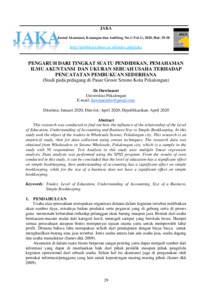 This research was conducted to find out how the influence of the relationship of the Level of Education, Understanding of Accounting and Business Size to Simple Bookkeeping. In this study took the object of the traders in Wholesale Setono, Pekalongan city. This research is an empirical study, then for data collection using census techniques. The research data was obtained from Wholesalers in Setono Wholesale, Pekalongan city, which is a sample in the study with 50 respondents. Test Analysis in this study uses multiple linear regression analysis. Data analysis was performed using the SPSS program. From the results of tests conducted in this study, it can be concluded that the level of education has a significant effect on simple bookkeeping, then understanding of accounting has a significant effect on simple bookkeeping, while for the size of a business does not have a significant effect on simple bookkeeping.