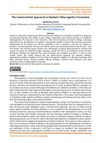 Abi, Krisna Arasit (2023) The constructivist approach to student's metacognitive formation. Indonesian Journal of Education and Development Research, 1 (1): 2. pp. 7-16. ISSN 3025-2385