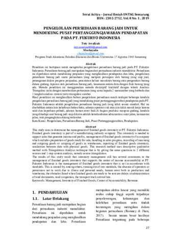 Tuty, Awaliyah and Muchayatin, Muchayatin (2019) Pengelolaan persediaan barang jadi untuk mendukung pusat pertanggungjawaban pendapatan pada PT. Fukuryo Indonesia. Serat Acitya, 8 (1): 2. pp. 27-40. ISSN 2302-2752