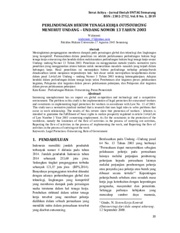 Widayanti, Widayanti (2019) Perlindungan hukum tenaga kerja outsourcing menurut Undang – Undang Nomor 13 Tahun 2003. Serat Acitya, 8 (1): 10. pp. 20-26. ISSN 2302-2752