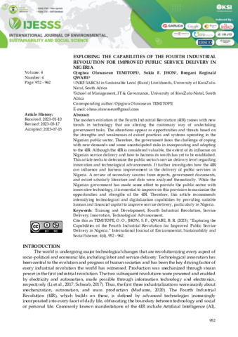 Ojogiwa, Oluwaseun Temitope and Sokfa, F. Jhon and Bongani, Reginald Qwabe (2023) Exploring the capabilities of the fourth industrial revolution for improved public service delivery in Nigeria. International Journal of Environmental, Sustainability and Social Science, 4 (4): 1. pp. 952-962. ISSN 2720-9644