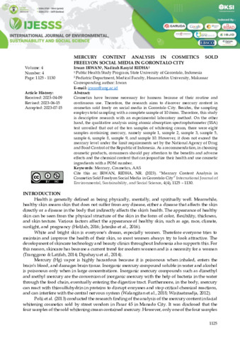 Irwan, Irwan and Nadirah, Rasyid Ridha (2023) Mercury content analysis in cosmetics sold freelyon social media in Gorontalo City. International Journal of Environmental, Sustainability and Social Science, 4 (4): 18. pp. 1125-1130. ISSN 2720-9644