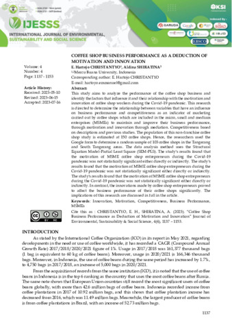 E., Hartojo Christantyo and Aldina, Shiratina (2023) Coffee shop business performance as a deduction of motivation and innovation. International Journal of Environmental, Sustainability and Social Science, 4 (4): 20. pp. 1137-1153. ISSN 2720-9644