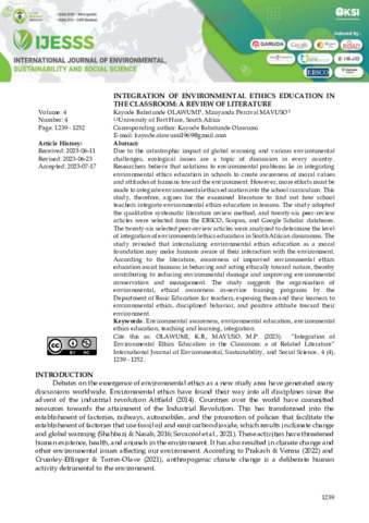 Kayode, Babatunde Olawumi and Mzuyanda, Percival Mavuso (2023) Integration of environmental ethics education in the classroom: a review of literature. International Journal of Environmental, Sustainability and Social Science, 4 (4): 27. pp. 1239-1252. ISSN 2720-9644