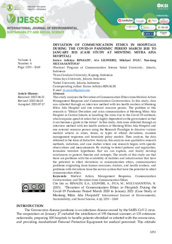 Enrico, Adhitya Rinaldi and Alo, Liliweri and Mikhael, Dua and Nandang, Mulyasantosa (2023) Deviation of communication ethics in hospitals during the covid-19 pandemic period March 2020 to January 2021: Case study at Menteng Mitra Afia Hospital. International Journal of Environmental, Sustainability and Social Science, 4 (4): 28. pp. 1253-1269. ISSN 2720-9644