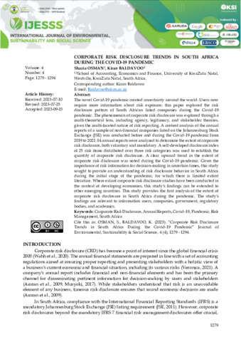 Shazia, Osman and Kiran, Baldavoo (2023) Corporate risk disclosure trends in South Africa during the covid-19 pandemic. International Journal of Environmental, Sustainability and Social Science, 4 (4): 30. pp. 1279-1294. ISSN 2720-9644