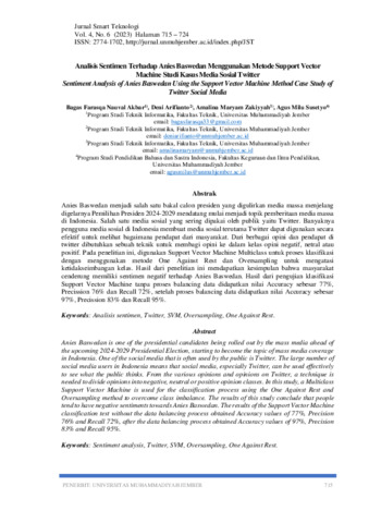 Bagas, Farasqa Nauval Akbar and Deni, Arifianto and Amalina, Maryam Zakiyyah and Agus, Milu Susetyo (2023) Analisis sentimen terhadap Anies Baswedan menggunakan metode support vector machine studi kasus media sosial twitter. Jurnal Smart Teknologi, 4 (6): 2. pp. 715-724. ISSN 2774-1702