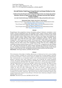 Pengembangan ilmu pengetahuan tentang infrastruktur gedung di Indonesia menciptakan variasi struktur, termasuk pembangunan baru dan pengalihan fungsi. Analisis kekuatan struktur penting untuk menghadapi perubahan pembebanan akibat alih fungsi. Penelitian ini berfokus pada analisis alternatif kerangka struktur Masjid Segara Swarga di Bernady Land dengan beton bertulang dan kapasitas pondasi eksisting. Metode analisis dinamik menggunakan aplikasi SAP2000, kinerja struktur dinilai sesuai SNI 2847-2019. Hasil analisis menunjukkan plat lantai 150 mm dengan tulangan Ø16 - 100 mm pada arah X dan Ø16 - 80 mm pada arah Y. Balok 20/50 memiliki tulangan geser Ø10 - 100 mm. Balok 15/30 dan 15/20 dengan variasi tulangan. Kolom 40/40 menggunakan tulangan 5D16 dan 3D16, kolom 25/25 menggunakan tulangan 3D12 dan 3D12. Dinding geser memerlukan tulangan minimum dengan syarat Vu > 0,083