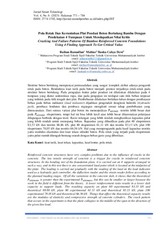 Raihan, Ramadlan Muhtar and Muhtar, Muhtar and Ilanka, Cahya Dewi (2023) Pola retak dan keruntuhan plat pondasi beton bertulang bambu dengan pendekatan 4 tumpuan untuk mendapatkan nilai kritis. Jurnal Smart Teknologi, 4 (6): 7. pp. 771-784. ISSN 2774-1702