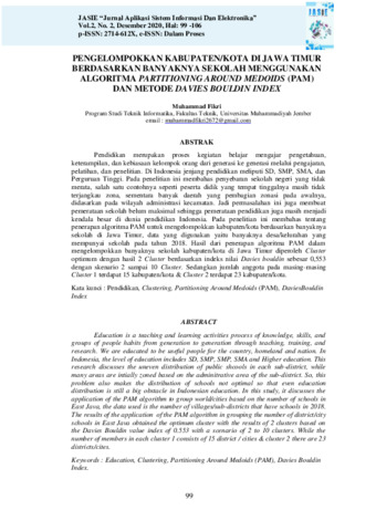 Muhammad, Fikri (2020) Pengelompokkan kabupaten/kota di Jawa Timur berdasarkan banyaknya sekolah menggunakan algoritma Partitioning Around Medoids (PAM) dan metode davies bouldin index. Jurnal Aplikasi Sistem Informasi dan Elektronika, 2 (2): 6. pp. 99-106. ISSN 2714-612X