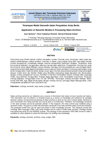 Iwan, Santosa and Panji, Yudasetya Wiwaha and Bernard, Renaldy Suteja (2023) Penerapan model semantik dalam pengolahan arsip berita. Justindo (Jurnal Sistem dan Teknologi Informasi Indonesia), 8 (2): 2. pp. 75-86. ISSN 2502-5724