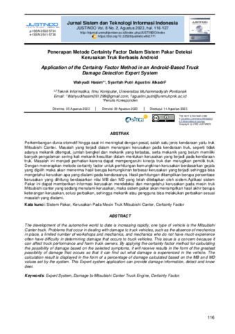 Wahyudi, Hasim and Syarifah, Putri Agustini Alkadri (2023) Penerapan metode certainty factor dalam sistem pakar deteksi kerusakan truk berbasis android. Justindo (Jurnal Sistem dan Teknologi Informasi Indonesia), 8 (2): 6. pp. 116-127. ISSN 2502-5724