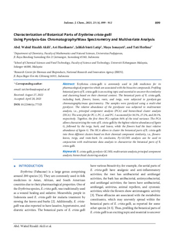 Abd., Wahid Rizaldi Akili and Ari, Hardianto and Jalifah, binti Latip and Maya, Ismayati and Tati, Herlina (2023) Characterization of botanical parts of Erythrina crista-galli using pyrolysis-gas chromatography/mass spectrometry and multivariate analysis. Indonesian Journal of Chemistry (Indones. J. Chem), 23 (4): 1. pp. 899-912. ISSN 1411-9420 e_ISSN: 2460-1578