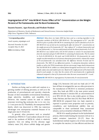 Suyanta, Suyanta and Agus, Kuncaka and Mudasir, Mudasir (2023) Impregnation of Fe3+ into MCM-41 pores: Effect of Fe3+ concentration on the weight percent of Fe-Frameworks and Fe-Non-Frameworks. Indonesian Journal of Chemistry (Indones. J. Chem), 23 (4): 8. pp. 984-996. ISSN 1411-9420 e_ISSN: 2460-1578