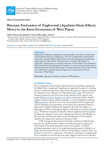 Andes, Hamuraby Rozak and Zaenal, Mutaqien and Destri, Destri (2021) Biomass estimation of Eaglewood (Aquilaria filaria (Oken) Merr.) in the karst ecosystem of West Papua. Journal of Tropical Biodiversity and Biotechnology, 6 (1). p. 59221. ISSN 2540-9581