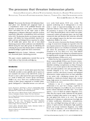 Sugeng, Budiharta and Didik, Widyatmoko and Irawati, Irawati and Harry, Wiriadinata (2011) The processes that threaten Indonesian plants. Oryx, 45 (2). pp. 172-179. ISSN 1365-3008
