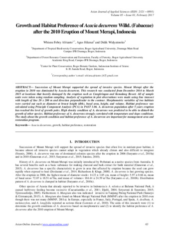 Whisnu, Febry Afrianto and Agus, Hikmat and Didik, Widyatmoko (2017) Growth and habitat preference of Acacia decurrens Willd. (Fabaceae) after the 2010 eruption of Mount Merapi, Indonesia. Asian Journal of Applied Sciences, 5 (1): 10. pp. 65-72. ISSN 2321-0893