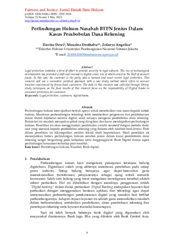 Davina, Dewi and Meurina, Desthabu and Zefanya, Angelica (2023) Perlindungan hukum nasabah BTPN Jenius dalam kasus pembobolan dana rekening. Fairness and Justice : Jurnal Ilmiah Ilmu Hukum, 21 (1): 2. pp. 9-20. ISSN 1858-0106