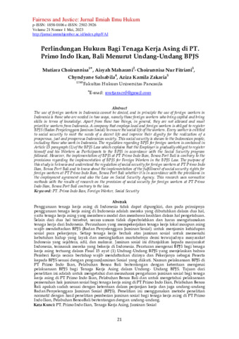 Mutiara, Choirunnisa and Aisyah, Maharani and Choirunnisa Nur, Fitriani and Chyndyane, Salsabila and Aziza Kamila, Zakaria (2023) Perlindungan hukum bagi tenaga kerja asing di PT. Primo Indo Ikan, Bali menurut Undang-Undang BPJS. Fairness and Justice : Jurnal Ilmiah Ilmu Hukum, 21 (1): 3. pp. 21-30. ISSN 1858-0106