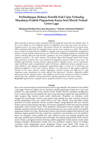 Muhamad Raihan Haryanto, Ramajaya and Handar Subhandi, Bakhtiar (2023) Perlindungan hukum pemilik hak cipta terhadap maraknya praktik plagiarisme karya seni musik terkait cover lagu. Fairness and Justice : Jurnal Ilmiah Ilmu Hukum, 21 (1): 5. pp. 44-50. ISSN 1858-0106