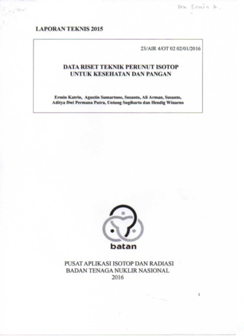 Katrin, Ermin and Sumartono, Agustin and Susanto, Susanto and Arman, Ali and Putra, Aditya Dwi Permana and Sugiharto, Untung and Fajarwati, Tetra and Winarno, Hendig (2015) Laporan Teknis 2015: DATA RISET TEKNIK PERUNUT ISOTOP UNTUK KESEHATAN DAN PANGAN. Technical Report. PAIR - BATAN.