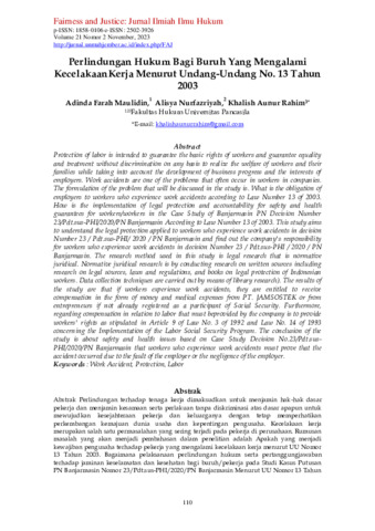 Adinda Farah, Maulidin and Alisya, Nurfazriyah and Khalish Aunur, Rahim (2023) Perlindungan hukum bagi buruh yang mengalami kecelakaan kerja menurut Undang-Undang No. 13 Tahun 2003. Fairness and Justice : Jurnal Ilmiah Ilmu Hukum, 21 (2): 6. pp. 110-120. ISSN 1858-0106