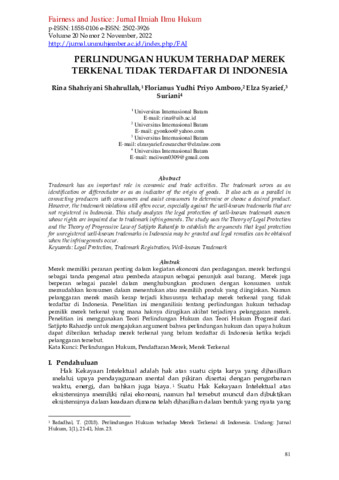 Rina Shahriyani, Shahrullah and Florianus Yudhi Priyo, Amboro and Elza, Syarief and Suriani, Suriani (2022) Perlindungan hukum terhadap merek terkenal tidak terdaftar di Indonesia. Fairness and Justice : Jurnal Ilmiah Ilmu Hukum, 20 (2): 2. pp. 81-96. ISSN 1858-0106