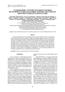 Shine, Pintor Siolemba Patiro and Kresno, Agus Hendarto and Hendrian, Hendrian and Hety, Budiyanti and Rubangi, Al-Hasan and Yumantoko, Yumantoko and Ahmad, Nur and Edi, Kurniawan and Naning, Yuniarti and Desmiwati, Desmiwati and Tri, Astuti Wisudayati and Deddy, Dwi Nur Cahyono and Yudha, Satria Aji Pratama and Yosephine, Martha Maria Anita Nugraheni and Tri, Dasta Nursehaneka Yatma (2023) Stakeholders’ attitude toward ecotourism development in Rinjani-Lombok geopark the evidence from mount Rinjani National Park. Jurnal Manajemen dan Kewirausahaan, 25 (1): 4. pp. 41-54. ISSN 1411-1438