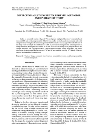 Lieli, Suharti and Hani, Sirine and Samuel, Martono (2023) Developing a sustainable tourism village model an exploratory study. Jurnal Manajemen dan Kewirausahaan, 25 (1): 6. pp. 63-82. ISSN 1411-1438