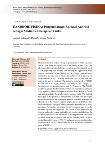 Annisa, Rahmah and Dewi, Muliyati (2023) Eandroid fisika pengembangan aplikasi android sebagai media pembelajaran fisika. Mitra Pilar: Jurnal Pendidikan, Inovasi, Dan Terapan Teknologi, 1 (1): 5. pp. 37-44. ISSN 2964-7622
