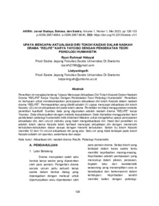 Penelitian ini mengkaji tentang “Upaya mencapai aktualisasi diri tokoh Kaizaki dalam naskah drama “Relife” karya Yayoiso dengan pendekatan teori psikologi humanistik”. Penelitian ini bertujuan untuk mendeskripsikan pencapaian aktualisasi diri tokoh Kaizaki dalam naskah drama “Relife”. Permasalahan yang diteliti adalah (1) upaya mencapai aktualisasi diri tokoh Kaizaki, (2) ciri-ciri aktualisasi diri pada tokoh utama. Penelitian ini dikaji menggunakan metode penelitian kualitatif. Sumber data yang digunakan adalah naskah drama “RELIFE” karya Yayoiso. Data dikumpulkan dengan metode kepustakaan. Data dianalisis menggunakan teori pendekatan psikologi humanistik milik Abraham Maslow untuk mengetahui upaya pencapaian aktualisasi diri, dan ciri-ciri individu yang telah mengaktualisasi diri. Hasil dari penelitian ini adalah tokoh utama Kaizaki telah berhasil mencapai aktualisasi diri dengan memenuhi kebutuhan-kebutuhan dasar sesuai dengan hierarki kebutuhan. Selain itu tokoh Kaizaki memiliki 12 dari 13 ciri-ciri aktualisasi diri yang ada. Satu ciri yang tidak terdapat pada tokoh Kaizaki adalah ciri spontan, sederhana dan wajar.