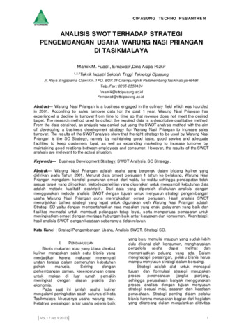 Mamik, M.Fuadi and Ernawati, Ernawati and Dina, Asipa Rizki (2023) Analisis SWOT terhadap strategi pengembangan usaha warung nasi Priangan di Tasikmalaya. Cipasung Techno Pesantren: Jurnal Ilmiah, 17 (1): 1. pp. 1-11. ISSN 1978-0842