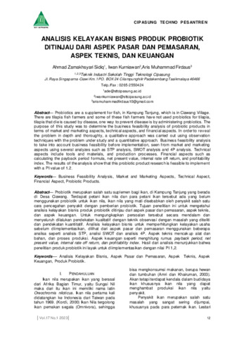Ahmad, Zamakhsyari Sidiq and Iwan, Kurniawan and Aris, Muhammad Firdaus (2023) Analisis kelayakan bisnis produk probiotik ditinjau dari aspek pasar dan pemasaran, aspek teknis, dan keuangan. Cipasung Techno Pesantren: Jurnal Ilmiah, 17 (1): 2. pp. 12-17. ISSN 1978-0842