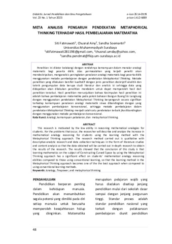 Siti, Fatmawati and Chusnal, Ainy and Sandha, Soemantri (2023) Meta analisis pengaruh pendekatan metaphorical thinking terhadap hasil pembelajaran matematika. Didaktis: Jurnal Pendidikan dan Ilmu Pengetahuan, 23 (1): 6. pp. 48-64. ISSN 1412-5889