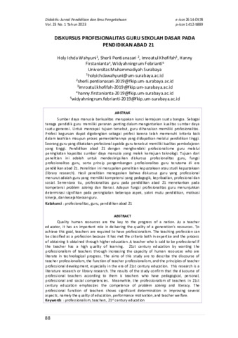 Holy, Ichda Wahyuni and Sherli, Pentianasari and Imroatul, Khofifah and Hanny, Firstanianta and Widyahningrum, Febrianti (2023) Diskursus profesionalitas guru sekolah dasar pada pendidikan abad 21. Didaktis: Jurnal Pendidikan dan Ilmu Pengetahuan, 23 (1): 9. pp. 88-98. ISSN 1412-5889