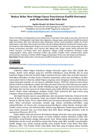 Imelda, Wenda and Ari, Retno Purwanti (2023) Budaya bakar batu sebagai upaya penyelesaian konflik horizontal pada masyarakat adat Suku Dani. Journal of Education Religion Humanities and Multidiciplinary, 1 (1): 1. pp. 1-11. ISSN 3025-7999