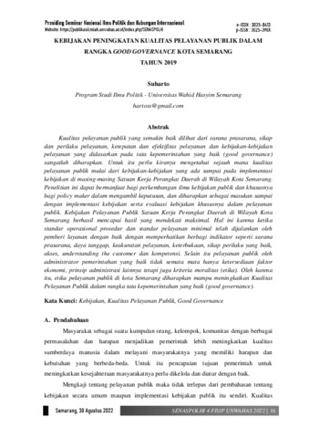 Suharto, Suharto (2022) Kebijakan peningkatan kualitas pelayanan publik dalam rangka good governance Kota Semarang tahun 2019. In: Prosiding Seminar Nasional Ilmu Politik dan Hubungan Internasional, 30 agustus 2022, Semarang.