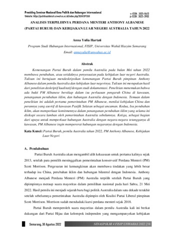 Anna, Yulia Hartati (2022) Analisis terpilihnya perdana menteri Anthony Albanese (Partai Buruh) dan kebijakan luar negeri Australia tahun 2022. In: Prosiding Seminar Nasional Ilmu Politik dan Hubungan Internasional, 30 agustus 2022, Semarang.
