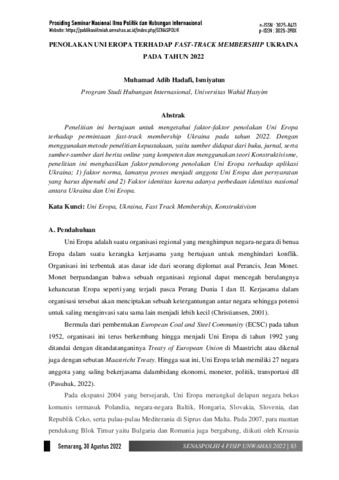 Muhamad, Adib Hadafi and Ismiyatun, Ismiyatun (2022) Penolakan Uni Eropa terhadap fast-track membership Ukraina pada tahun 2022. In: Prosiding Seminar Nasional Ilmu Politik dan Hubungan Internasional, 30 agustus 2022, Semarang.