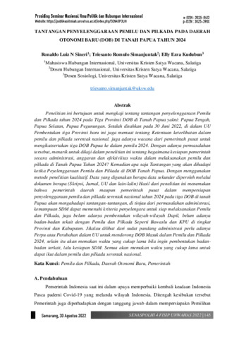 Ronaldo, Luiz N Sineri and Triesanto, Romulo Simanjuntak and Elly, Ezra Kudubun (2022) Tantangan penyelenggaraan Pemilu dan Pilkada pada Daerah Otonomi Baru (DOB) di tanah Papua tahun 2024. In: Prosiding Seminar Nasional Ilmu Politik dan Hubungan Internasional, 30 Agustus 2022, Semarang.