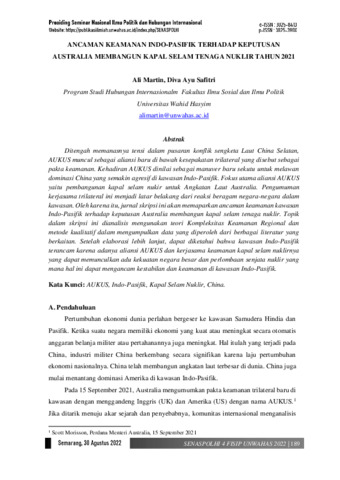 Ali, Martin and Diva, Ayu Safitri (2022) Ancaman keamanan Indo-Pasifik terhadap keputusan Australia membangun kapal selam tenaga nuklir tahun 2021. In: Prosiding Seminar Nasional Ilmu Politik dan Hubungan Internasional, 30 Agustus 2022, Semarang.